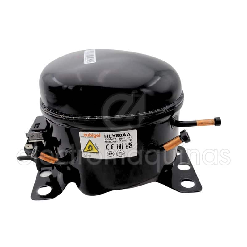 Compressor para frigoríficos, arcas e sistemas de refrigeração. O compressor é o componente responsável por circular o gás refrigerante no sistema, permitindo manter a temperatura interna do frigorífico. Garante o arrefecimento contínuo e a conservação adequada dos alimentos.