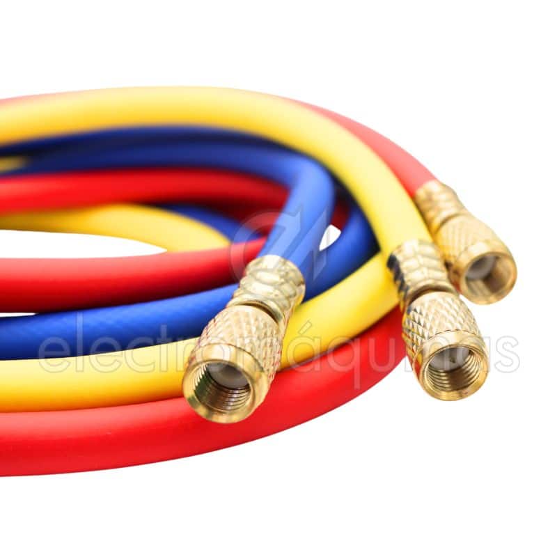 Conjunto de 3 mangueiras (vermelha, azul e amarela), utilizadas em sistemas de refrigeração, especialmente em frigoríficos comerciais e industriais que operam com gás R410A.