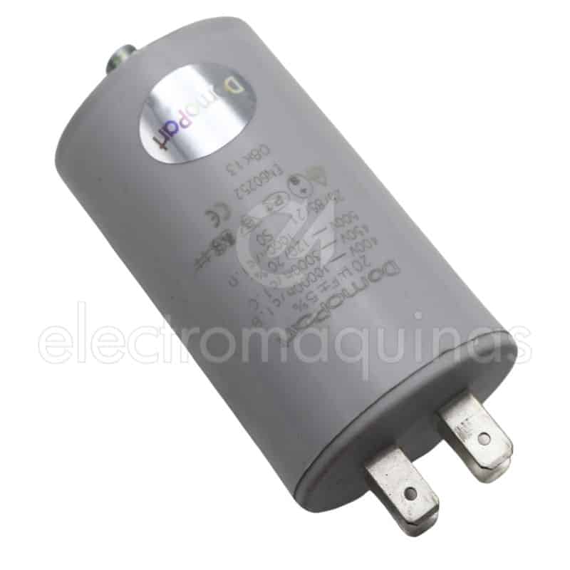 Condensador 20MF. O condensador funciona em conjunto com o motor. Quando o condensador se encontra defeituoso, pode fazer com que o motor da sua máquina não arranque ou se torne ruidoso e desperdice energia.
