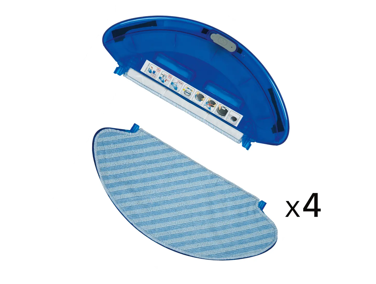 Suporte para mopas de microfibra e 4 mopas de microfibra. A marca recomenda a troca de mopas a cada 6 meses. O esfregão adere ao depósito, que pode conter até 110 ml de água.