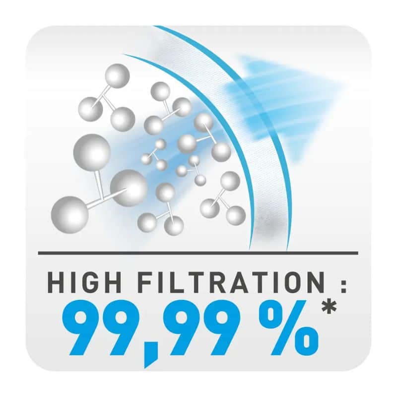 O saco de aspirador de alta filtragem oferece um poder de retenção de 99,99%* das micropartículas, garantindo uma limpeza eficaz e um ambiente mais higiénico. É ideal para pessoas com alergias ou que procuram uma filtragem superior.