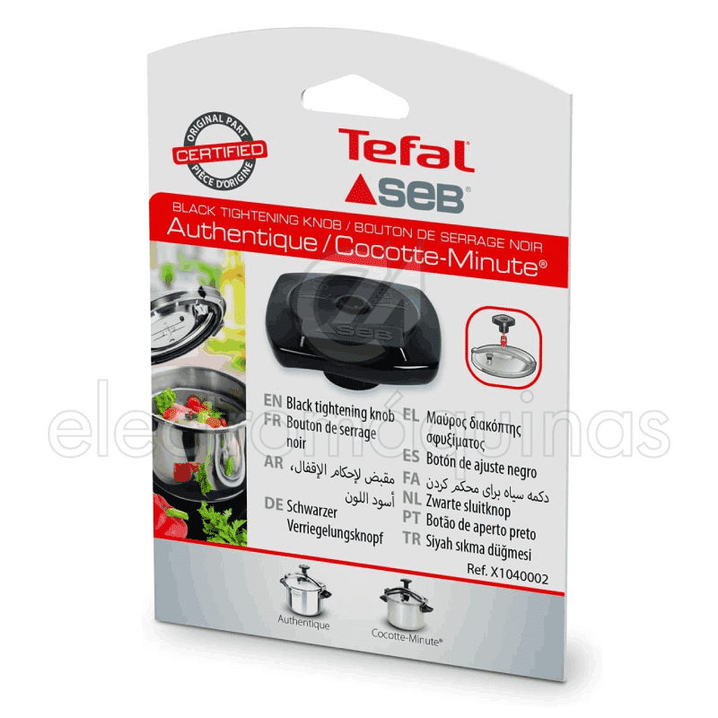 Botão de aperto para panela de pressão Tefal. O botão de aperto para panela de pressão Tefal é essencial para garantir o fecho seguro da tampa, mantendo a pressão adequada durante a cozedura. Assegura que o vapor permanece no interior da panela, permitindo uma confeção rápida, eficiente e segura dos alimentos.